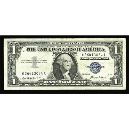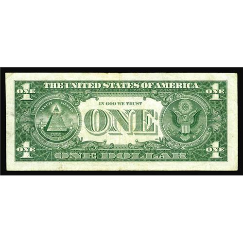 <B>Fr. 1619 $1 1957 Silver Certificate. Inverted "W" in Right Serial Very Fine.</B></I><BR>This note is briefly discussed on page 374 of Stephen M. Sullivan's US Error Note Encyclopedia. The survival rate of this error was quite minimal due to the similarity between the BEP's M and inverted W. A neat reminder of how the human element at the BEP influences our hobby. No error collection would be complete without this note.