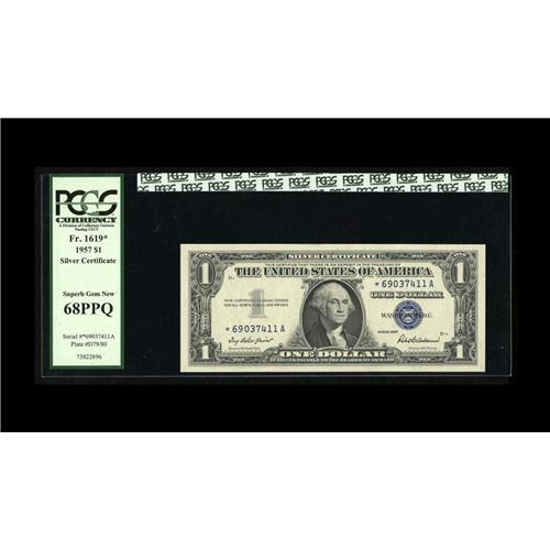 <B>Fr. 1619* $1 1957 Silver Certificate. PCGS Superb Gem New 68PPQ.</B></I><BR>The "classic" phrase of "boardwalk margins" rings true for this Star.