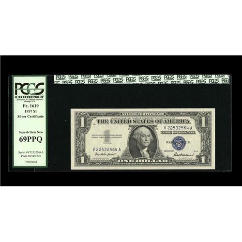 <B>Fr. 1619 $1 1957 Silver Certificate. PCGS Superb Gem New 69PPQ.</B></I><BR>This acute cornered Ace is consecutive to the last lot.