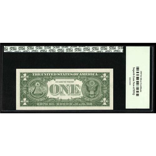 <B>Fr. 1619 $1 1957 Silver Certificate. PCGS Superb Gem New 67PPQ.</B></I><BR>This tough note is presented in a decidedly uncommon grade. The fussiest collector will be satisfied with this jumbo margined $1 Silver Certificate off the B-B block.