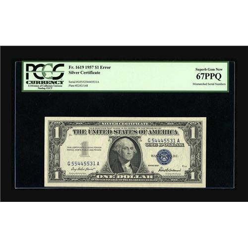 <B>Fr. 1619 $1 1957 Silver Certificate. PCGS Superb Gem New 67PPQ.</B></I><BR>This is a premium, well margined example of the G55/G54 mismatched serial number.<BR><BR><b>Shipping:</b> Coin/Currency (<a target="_blank" href="http://www.heritageauctions.com/common/shipping.php">view shipping information</a>)