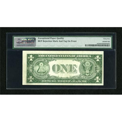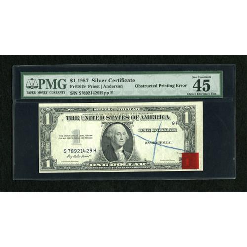 <B>Fr. 1619 $1 1957 Silver Certificate. PMG Extremely Fine 45 EPQ.</B></I><BR> Despite the obstruction and the rejection mark this neat error still escaped the BEP to be enjoyed today.<BR><BR><b>Shipping:</b> Coins & Currency (<a target="_blank" href="http://www.heritageauctions.com/common/shipping.php">view shipping information</a>)