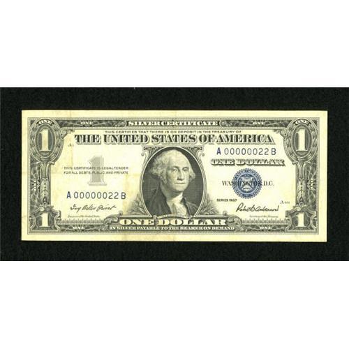 <B>Fr. 1619 $1 1957 Silver Certificate. Serial Number 22 Very Fine.</B></I><BR> A most pleasing double digit serial number of 22 is carried on this A-B block note.<BR><BR><b>Shipping:</b> Coins & Currency (<a target="_blank" href="http://www.heritageauctions.com/common/shipping.php">view shipping information</a>)