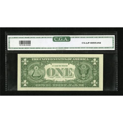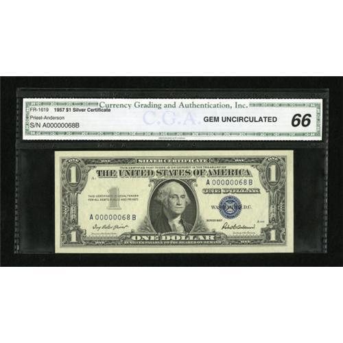 <B>Fr. 1619 $1 1957 Silver Certificate with low #68. CGA Gem Uncirculated 66.</B></I><BR> Low serial number A00000068B is found on this modern silver Ace.<BR><BR><b>Shipping:</b> Coins & Currency (<a target="_blank" href="http://www.heritageauctions.com/common/shipping.php">view shipping information</a>)