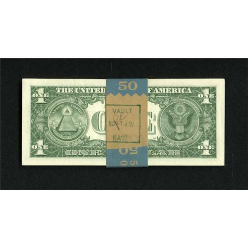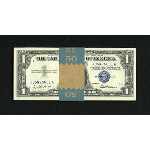 <B>Fr. 1619 $1 1957 Silver Certificates. 50 Consecutive Examples Very Choice Crisp Uncirculated.</B></I><BR> This half-pack of crisp and well margined Blue Seals has a modern strap.<BR><BR><b>Shipping:</b> Coins & Currency (<a target="_blank" href="http://www.heritageauctions.com/common/shipping.php">view shipping information</a>)