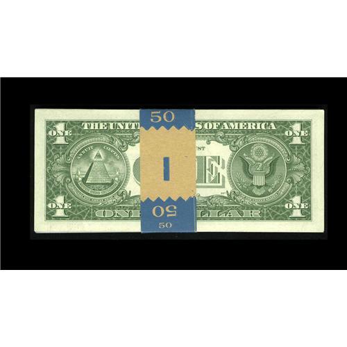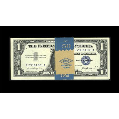 <B>Fr. 1619 $1 1957 Silver Certificates. Fifty Consecutive Examples Choice Crisp Uncirculated.</B></I><BR>This original half pack hails from the R-A block for the series. The first note has a bent corner.