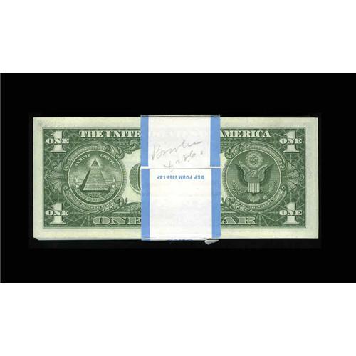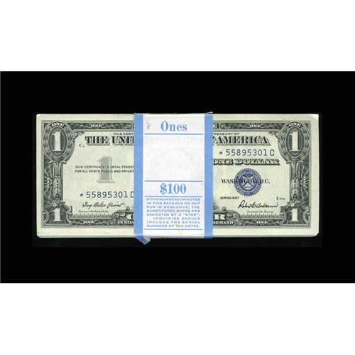<B>Fr. 1619* $1 1957 Silver Certificates. Original Pack of 100 Very Choice Crisp Uncirculated.</B></I><BR>This bank wrapped pack of early replacement notes has examples that display only the most minimal handling.<BR>