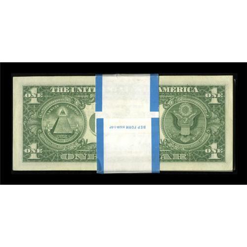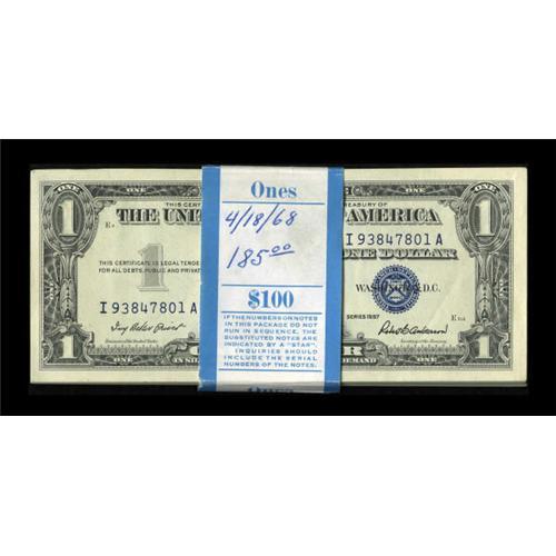 <B>Fr. 1619 $1 1957 Silver Certificates. Original Pack of 100.</B></I> <B>Gem Crisp Uncirculated.</B></I><BR> This pack is mostly Gem in grade with broad, even margins throughout the pack. The first note shows a broad fold and some of the last notes show some tip folds that are wholly outside of the margins.<BR><BR><b>Shipping:</b> Coins & Currency (<a target="_blank" href="http://www.heritageauctions.com/common/shipping.php">view shipping information</a>)