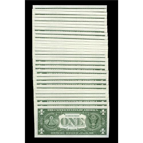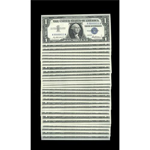 <B>Fr. 1619 $1 1957 Silver Certificates. Thirty-two Examples. Treasury Presentation Set # 12 Gem Crisp Uncirculated.</B></I><BR>This was the twelfth sheet printed for the 1957 Series. Then it was cut up at the BEP and deposited in a Treasury Department envelope. It must be remembered that notes on a 32 subject sheet are not numbered consecutively and in this case each note advances by 20,000. The notes are beautiful and were originally intended for a dignitary.