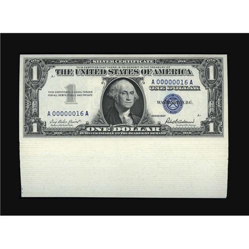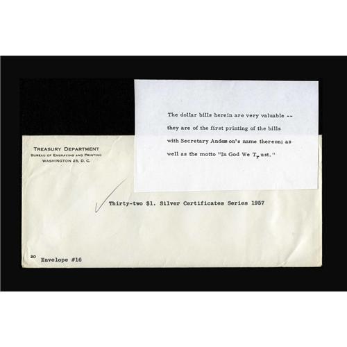 <B>Fr. 1619 $1 1957 Silver Certificates. Thirty-two Examples. Treasury Presentation Set # 16 Gem Crisp Uncirculated.</B></I><BR>This was the sixteenth sheet printed for the 1957 Series. Then it was cut up at the BEP and deposited in a Treasury Department envelope. Notes on a 32 subject sheet are not numbered consecutively and in this case each note advances by 20,000. The notes are beautiful and were originally intended for a dignitary. It must be remembered that distribution of uncut sheets ended on January 6, 1954. Therefore, this explains why these first few sheets for the 1957 Series were cut up and prepared for distribution in this form.<BR><BR><b>Shipping:</b> Coin/Currency (<a target="_blank" href="http://www.heritageauctions.com/common/shipping.php">view shipping information</a>)