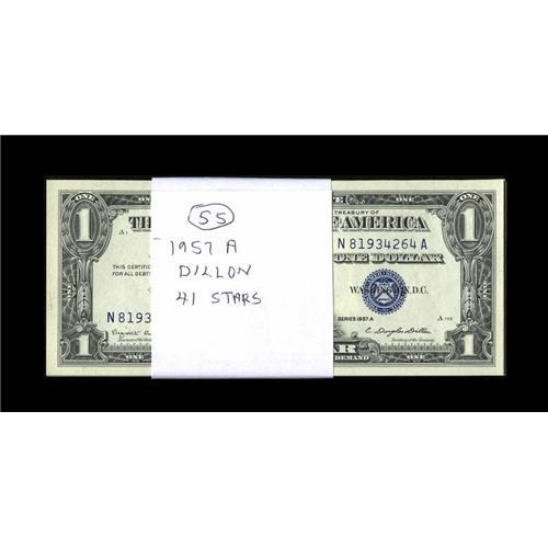 <B>Fr. 1619* $1 1957 Silver Certificates. Two Examples. Gem CU</B></I><BR><B>Fr. 1620 $1 1957A Silver Certificates. Fourteen Examples. Gem CU</B></I><BR><B>Fr. 1620* $1 1957A Silver Certificates. Thirty-eight Examples. Gem CU</B></I><BR><B>Fr. 1621* $1 1957B Silver Certificate. Gem CU.</B></I><BR>One of the Fr. 1620 notes grades no better than VF and all but one of the Fr. 1620*'s is consecutive.<BR><BR><b>Shipping:</b> Coins & Currency (<a target="_blank" href="http://www.heritageauctions.com/common/shipping.php">view shipping information</a>)