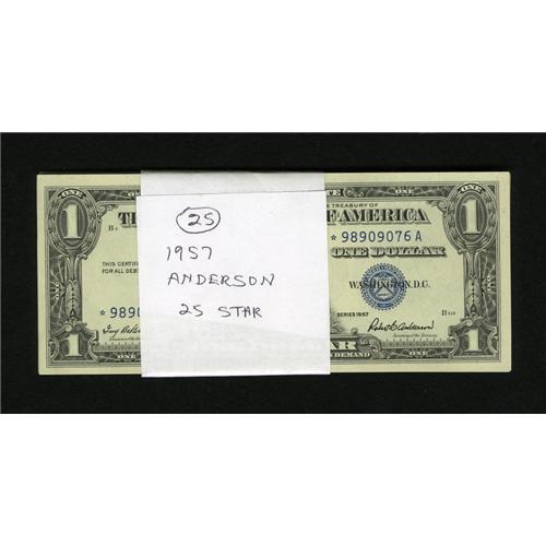 <B>Fr. 1619* Twenty-Five $1 1957 Silver Certificates. Gem Crisp Uncirculated.</B></I><BR>Huge margins and cavernous embossing are found on every star in this group.<BR><BR><b>Shipping:</b> Coins & Currency (<a target="_blank" href="http://www.heritageauctions.com/common/shipping.php">view shipping information</a>)