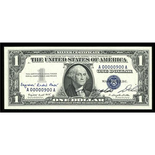 <B>Fr. 1620 $1 1957A Silver Certificate. Very Choice Crisp Uncirculated. Dual Courtesy Autograph.</B></I><BR>This simply stunning note that carries fancy serial number A00000900A has also been graciously signed by Smith and Dillon. There is a touch of handling in the right margin.