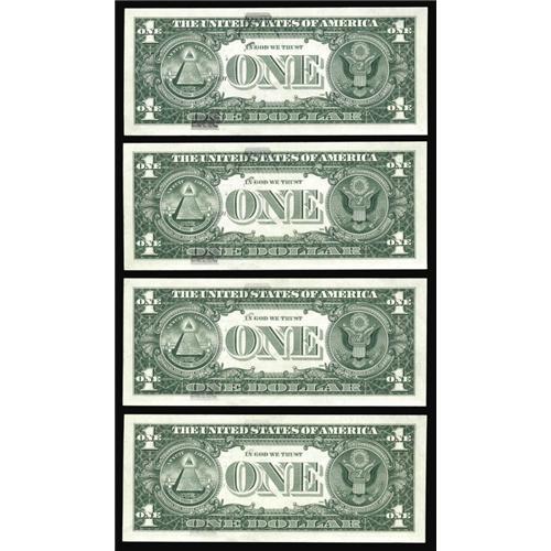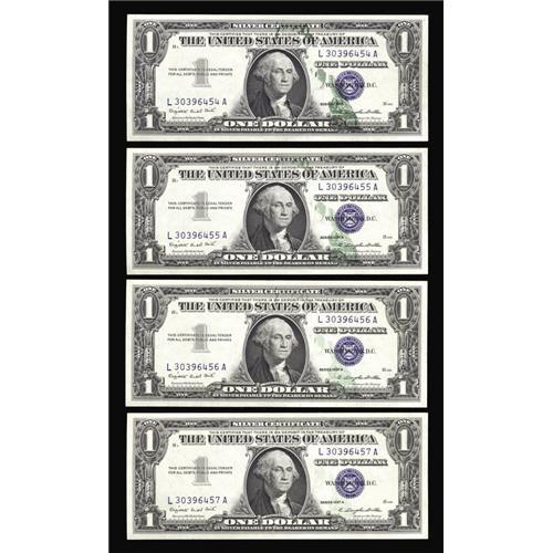 <B>Fr. 1620 $1 1957A Silver Certificates. Gem Crisp Uncirculated.</B></I> A run of four consecutive notes with two separate areas of the offsets on the face and back. The first two are quite strong and the last two considerably weaker. While offset errors in the Federal Reserve Note series are quite readily available, any error notes, especially those that are consecutive, are rather difficult to encounter in the Silver Certificate series. Compounding the fact that these are multiple offsets adds to the allure of this quartet.<BR>
