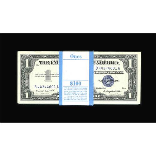 <B>Fr. 1620 $1 1957A Silver Certificates. Original Pack of 100. Gem Crisp Uncirculated.</B></I><BR>A lovely pack of 100 which is certain to please.
