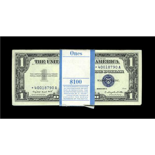 <B>Fr. 1620 $1 1957A Silver Certificates. Original Pack of 100. Gem Crisp Uncirculated.</B></I><BR>This pack kicks off with a star note<BR><BR><b>Shipping:</b> Coin/Currency (<a target="_blank" href="http://www.heritageauctions.com/common/shipping.php">view shipping information</a>)