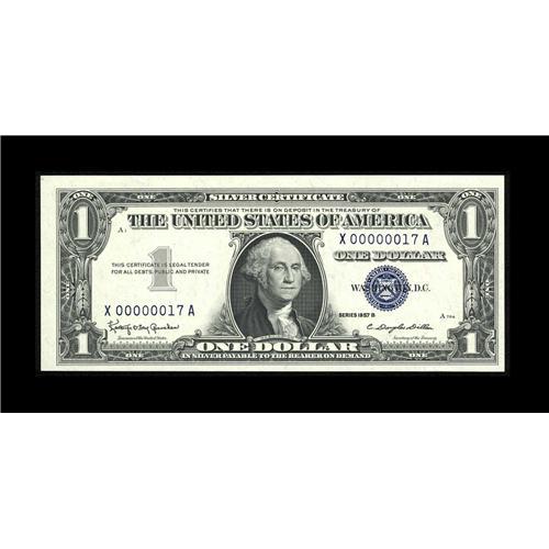 <B>Fr. 1621 $1 1957B Silver Certificate. Choice Crisp Uncirculated.</B></I><BR>This note from the X-A Block carries low two digit serial number 17. Plenty of punch thru embossing is seen.