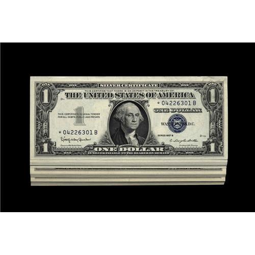 <B>Fr. 1621* $1 1957B Silver Certificate. Fifty Consecutive Examples. Very Choice CU-Gem CU.</B></I><BR>An attractive, original half-pack of stars that will surely draw interest from collectors seeking eye appealing runs of consecutive notes.