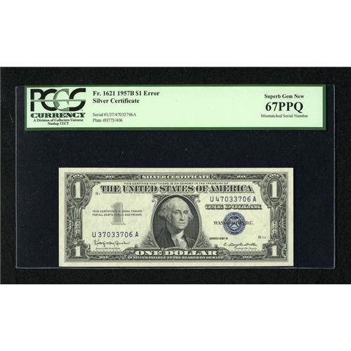 <B>Fr. 1621 $1 1957B Silver Certificate. PCGS Superb Gem New 67PPQ.</B></I><BR>This pleasing note boasts the U37/47 mismatched serial number. The margins are perfectly ample and even.<BR><I>From The Jacob and Heather Dedman Collection</B></I><BR><BR><b>Shipping:</b> Coins & Currency (<a target="_blank" href="http://www.heritageauctions.com/common/shipping.php">view shipping information</a>)
