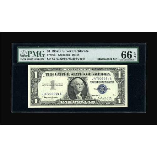 <B>Fr. 1621 $1 1957B Silver Certificate. PMG Gem Uncirculated 66 EPQ.</B></I><BR><B></B></I> Another pleasing well margined note from the popular U37/U47 mismatch. One of a pair of consecutive notes.<BR><BR><b>Shipping:</b> Coins & Currency (<a target="_blank" href="http://www.heritageauctions.com/common/shipping.php">view shipping information</a>)
