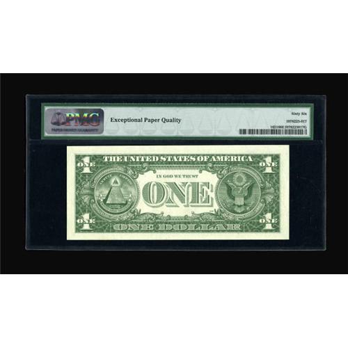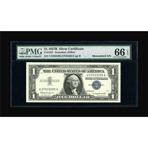 <B>Fr. 1621 $1 1957B Silver Certificate. PMG Gem Uncirculated 66 EPQ.</B></I><BR> Nice even margins are noticed on this fresh U37/U47 mismatch.<BR><BR><b>Shipping:</b> Coins & Currency (<a target="_blank" href="http://www.heritageauctions.com/common/shipping.php">view shipping information</a>)