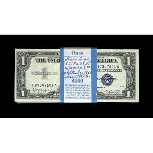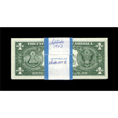 <B>Fr. 1621 $1 1957B Silver Certificate. Original Pack of 100. Gem Crisp Uncirculated.</B></I><BR> An original pack of 100 notes, complete with the band, which is inscribed with a past owner's name and address and a date of September, 1963. <BR><BR><b>Shipping:</b> Coins & Currency (<a target="_blank" href="http://www.heritageauctions.com/common/shipping.php">view shipping information</a>)