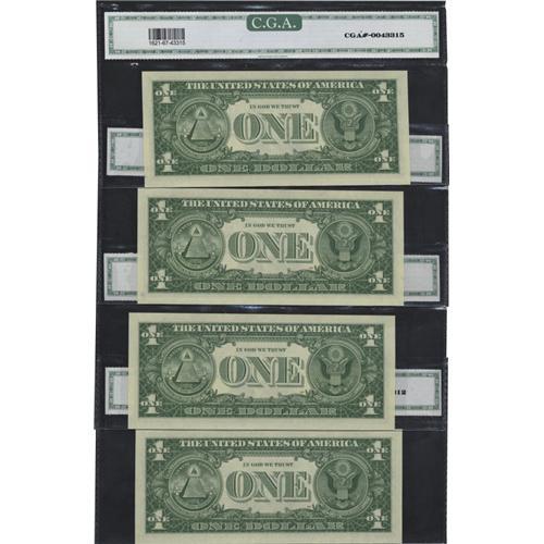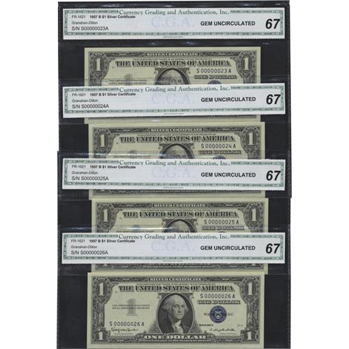 <B>Fr. 1621 $1 1957B Silver Certificates. Four Consecutive Low Serial Number Examples. CGA Gem Uncirculated 67</B></I>.<B></B></I><BR> This S-A block quartet carries low two digit serial numbers S00000023A, 24A, 25A, and 26A.<BR><BR><b>Shipping:</b> Coins & Currency (<a target="_blank" href="http://www.heritageauctions.com/common/shipping.php">view shipping information</a>)