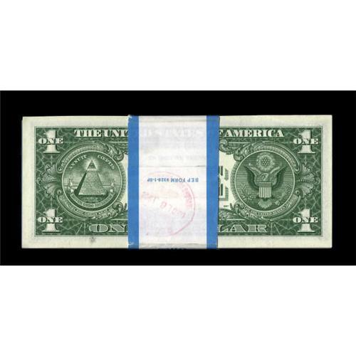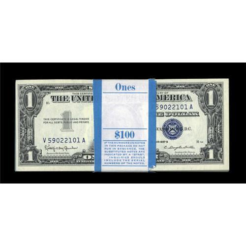 <B>Fr. 1621 $1 1957B Silver Certificates. Original Pack of 100. Choice Crisp Uncirculated</B></I>.<B></B></I><BR> The date stamped on the BEP wrapper on these crisp examples exhibiting some corner bumps is Dec. 6, 1963.<BR><BR><b>Shipping:</b> Coins & Currency (<a target="_blank" href="http://www.heritageauctions.com/common/shipping.php">view shipping information</a>)