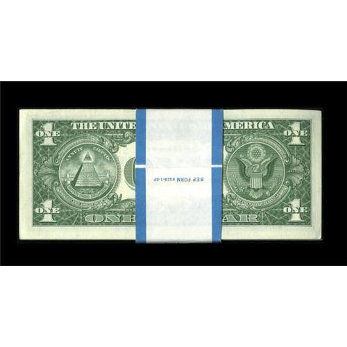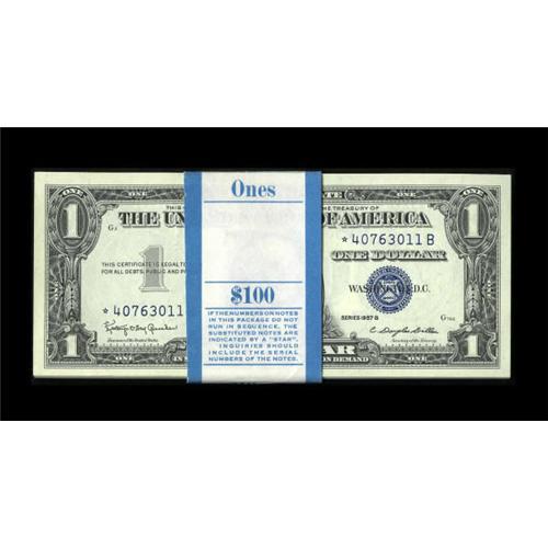 <B>Fr. 1621 $1 1957B Silver Certificates. Pack of 100. Very Choice Crisp Uncirculated.</B></I><BR> Five star notes start off this pack though the original five first notes in this pack have been replaced. Perhaps they were stars as well. Ninety-five consecutive well margined S-A block notes make up the bulk of the pack.<BR><BR><b>Shipping:</b> Coins & Currency (<a target="_blank" href="http://www.heritageauctions.com/common/shipping.php">view shipping information</a>)