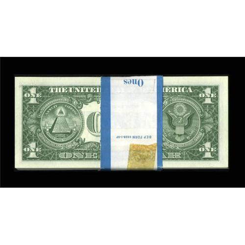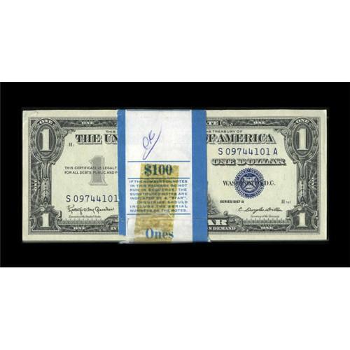 <B>Fr. 1621 $1 1957B Silver Certificates. Pack of 100. Choice Crisp Uncirculated.</B></I><BR> Five star notes have been placed at the end of this pack. A few of the first and last notes show some handling and light folds. There are ninety-five consecutive S-A block notes and five consecutive star notes.<BR><BR><b>Shipping:</b> Coins & Currency (<a target="_blank" href="http://www.heritageauctions.com/common/shipping.php">view shipping information</a>)