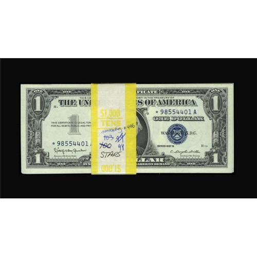 <B>Fr. 1621* $1 1957B Silver Certificates. Ninety-nine Examples. Choice Crisp Uncirculated.</B></I><BR> Wide margins and nice centering are traits of this pack that would and could be called Gem by many. The 96th note is missing from this pack.<BR><I>From The Drew Keough Collection</B></I><BR><BR><b>Shipping:</b> Coins & Currency (<a target="_blank" href="http://www.heritageauctions.com/common/shipping.php">view shipping information</a>)