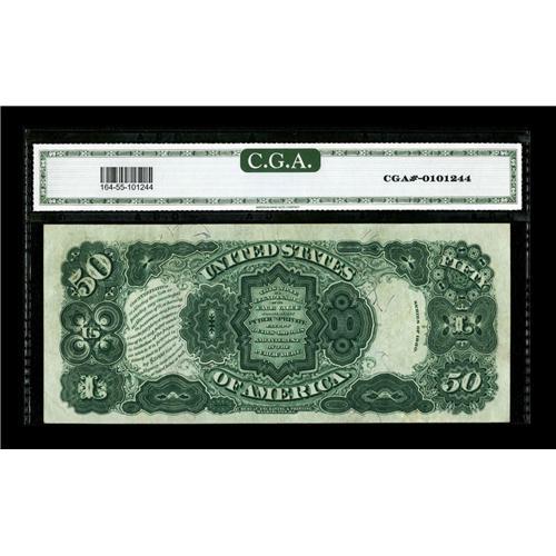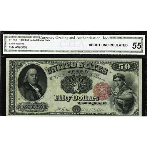 <B>Fr. 164 $50 1880 Legal Tender CGA About Uncirculated 55.</B></I> Off the market for over 40 years and originally sold as CU then, this note displays very clean surfaces. Just a hair under 200 notes are known with less than 15% of those falling into the upper grades. A tight bottom margin is offset by three other large and even margins producing a most attractive piece.
