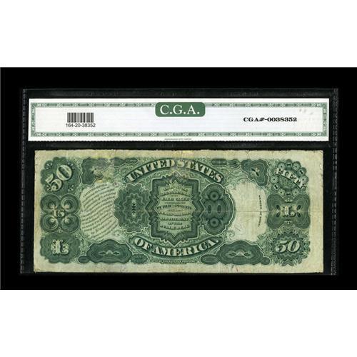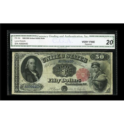<B>Fr. 164 $50 1880 Legal Tender CGA Very Fine 20 Repaired.</B></I> Three corner tips have been replaced outside the design area, and there are several repaired splits. Nonetheless, this 1880 Fifty faces up rather well, and should likely prove to be a relatively inexpensive way to represent this challenging Type.<BR><I>From The Collection of Greg Southward</B></I><BR><BR><b>Shipping:</b> Coins & Currency (<a target="_blank" href="http://www.heritageauctions.com/common/shipping.php">view shipping information</a>)