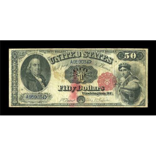 <B>Fr. 164 $50 1880 Legal Tender Fine.</B></I> Save for a distracting red stain at the bottom center, this Fifty Dollar Legal would be problem-free. The edges are solid and the margins are excellent.<BR><BR><b>Shipping:</b> Coins & Currency (<a target="_blank" href="http://www.heritageauctions.com/common/shipping.php">view shipping information</a>)