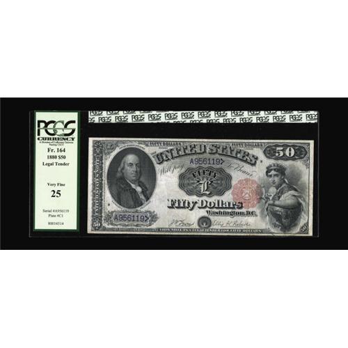 <B>Fr. 164 $50 1880 Legal Tender PCGS Very Fine 25.</B></I> This is a popular grade that this popular design is desired in. Even circulation drapes this overall bright $50.
