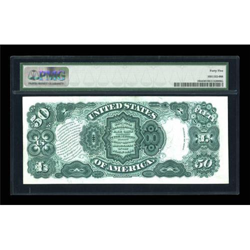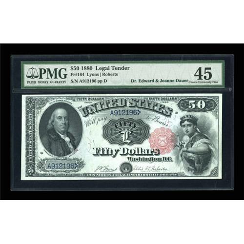 <B>Fr. 164 $50 1880 Legal Tender PMG Choice Extremely Fine 45.</B></I> The census for Fr. 164 is a bit of an anomaly. Very nearly 200 notes are known, but there are scant few Uncirculated pieces. PMG has not graded a single example over the 55 grade - in fact, they have graded only three pieces above this 45 level. We don't have PCGS's numbers, but Track & Price shows no PCGS Fr. 164 above the 40 level. Even when the often optimistically-graded raw notes are considered, only five 164s have been called Uncirculated. Our point here is that this 45 is a lot of grade for this number. The note is beautifully well margined with back centering that is fully the equal of the nicely centered face. This note is used to illustrate its type on page 115 of the Dauers' book.<BR><I>From The Dr. Edward & Joanne Dauer Collection</B></I><BR><BR><b>Shipping:</b> Coins & Currency (<a target="_blank" href="http://www.heritageauctions.com/common/shipping.php">view shipping information</a>)