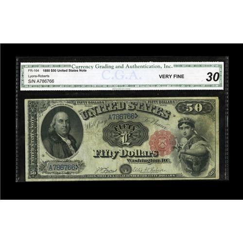 <B>Fr. 164 $50 1880 Legal Tender CGA Very Fine 30.</B></I> There are four small pinholes as well as a partially removed penned number on the back. From the face, this is a very attractive example of this higher-denomination type.<BR><I>From The Ross Bailey Collection</B></I>