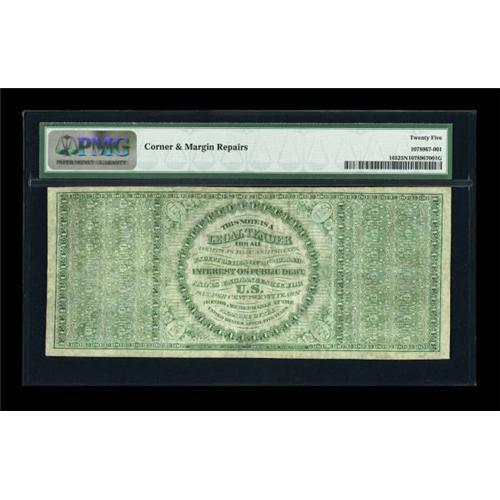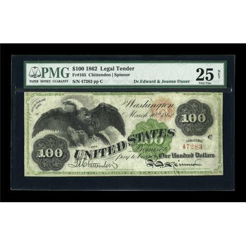 <B>Fr. 165 $100 1862 Legal Tender PMG Very Fine 25.</B></I> Thirteen examples of this note are known, and to date, this is the highest example graded by either service. A PCGS 12 realized $27,600 in October 2005. This is the only example of this number that PMG has graded. The 25 grade is a Net grade that has been lowered due to "Corner and Margin Repair." None of the repairs appears significant, and they are typical for all denominations of these early Legal issues since the very thin paper had a tendency to chip and split at its edges. According to the Dauers' book, the appearance of the American eagle on this note was its first use on Federal currency. Both sides of this note are illustrated on page 116. The $27,000 price realized by the PCGS 12 in 2005 is the record for a Fr. 165. That should be very easily eclipsed when the hammer falls tonight on this handsome example.<BR><I>From The Dr. Edward & Joanne Dauer Collection</B></I><BR><BR><b>Shipping:</b> Coins & Currency (<a target="_blank" href="http://www.heritageauctions.com/common/shipping.php">view shipping information</a>)