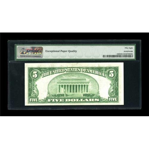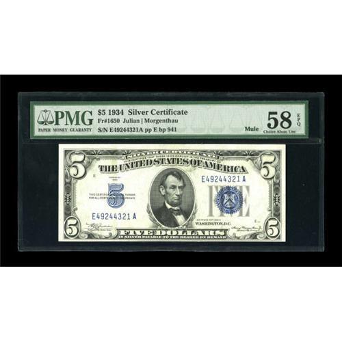 <B>Fr. 1650 $5 1934 Mule Silver Certificate. PMG About Uncirculated 58 EPQ.</B></I><BR> The third and perhaps the nicest of this mini-run.<BR><BR><b>Shipping:</b> Coins & Currency (<a target="_blank" href="http://www.heritageauctions.com/common/shipping.php">view shipping information</a>)
