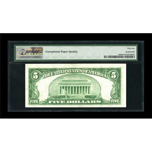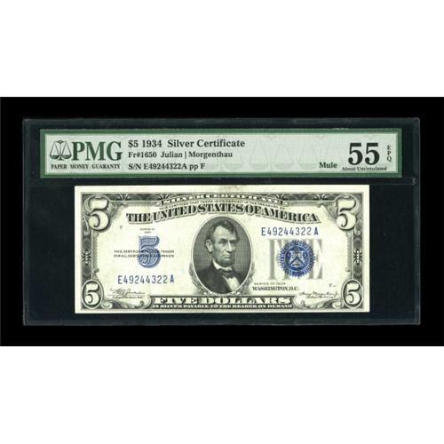 <B>Fr. 1650 $5 1934 Mule Silver Certificate. PMG About Uncirculated 55 EPQ.</B></I><BR> The last E-A Block issue from this run.<BR><BR><b>Shipping:</b> Coins & Currency (<a target="_blank" href="http://www.heritageauctions.com/common/shipping.php">view shipping information</a>)