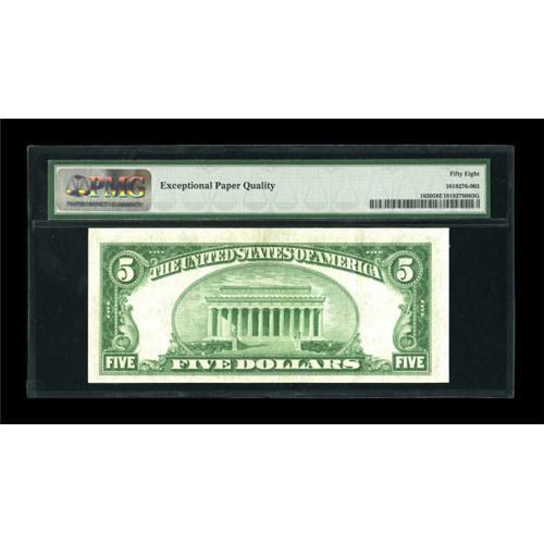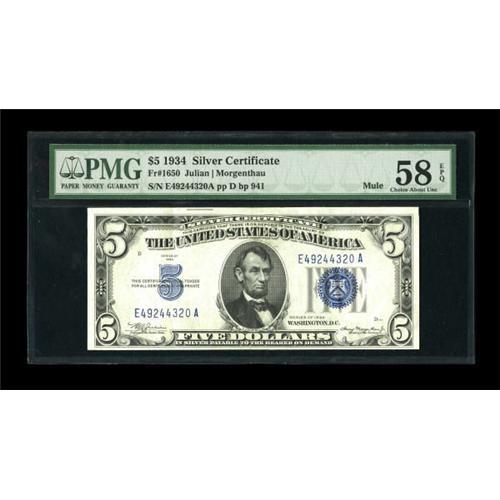 <B>Fr. 1650 $5 1934 Mule Silver Certificate. PMG About Uncirculated 58 EPQ.</B></I><BR> The second in a group of five well matched pieces.<BR><BR><b>Shipping:</b> Coins & Currency (<a target="_blank" href="http://www.heritageauctions.com/common/shipping.php">view shipping information</a>)