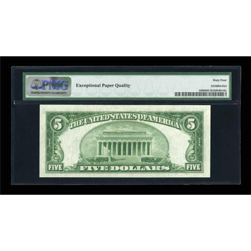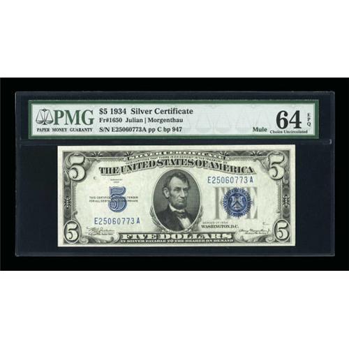 <B>Fr. 1650 $5 1934 Mule Silver Certificate. PMG Choice Uncirculated 64 EPQ.</B></I><BR> This is a lovely example of the very scarce E-A block that lists for $1,250 in the latest Schwartz tome. This spectacular example has garnered the dual comments "Exceptional Paper Quality" as well as "Great embossing," both of which are clearly evident through the holder.<BR><BR><b>Shipping:</b> Coins & Currency (<a target="_blank" href="http://www.heritageauctions.com/common/shipping.php">view shipping information</a>)