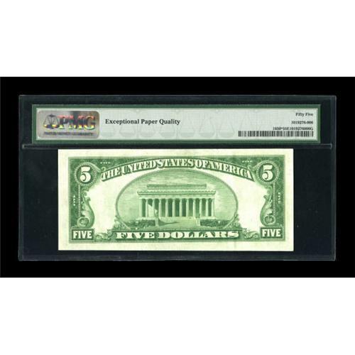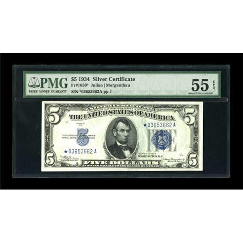 <B>Fr. 1650* $5 1934 Silver Certificate Star. PMG About Uncirculated 55 EPQ.</B></I><BR> Embossing is seen on this bright single-folded Star that is from the first series of the small size $5 silvers.<BR><BR><b>Shipping:</b> Coins & Currency (<a target="_blank" href="http://www.heritageauctions.com/common/shipping.php">view shipping information</a>)