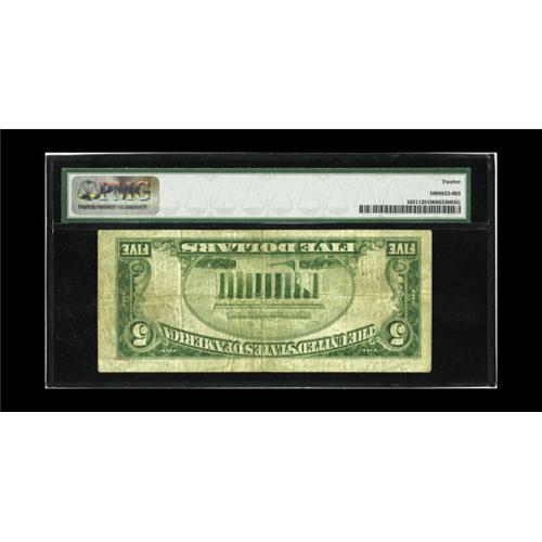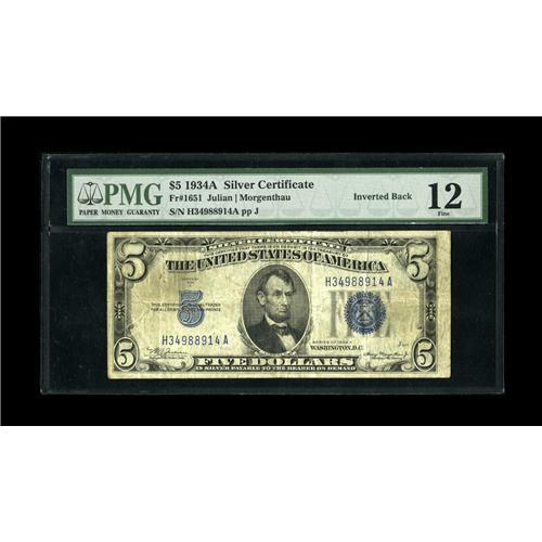 <B>Fr. 1651 $5 1934A Silver Certificate. PMG Fine 12.</B></I><BR>Flat out rare as an invert, that would make an interesting companion to the mule note. Solid margins are noticed.