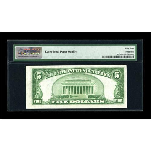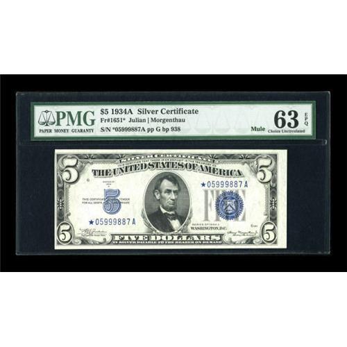 <B>Fr. 1651* $5 1934A Mule Silver Certificate. PMG Choice Uncirculated 63 EPQ.</B></I><BR> Crackling fresh and fully embossed, a scarce star in this grade that would easily rate the Gem designation with but a hair more left margin.<BR><BR><b>Shipping:</b> Coins & Currency (<a target="_blank" href="http://www.heritageauctions.com/common/shipping.php">view shipping information</a>)