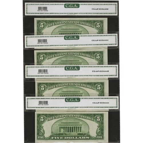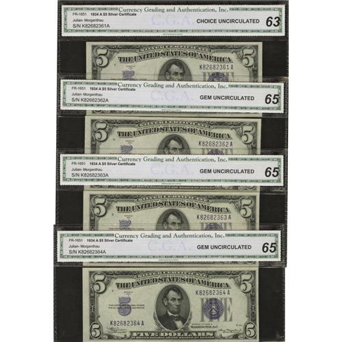 <B>Fr. 1651 $5 1934A Silver Certificates. Four Consecutive Examples. CGA Choice Uncirculated 63 or Better.</B></I><BR>The first note is a 63 and the last three notes tip the scales at 65.<BR><BR><b>Shipping:</b> Coins & Currency (<a target="_blank" href="http://www.heritageauctions.com/common/shipping.php">view shipping information</a>)