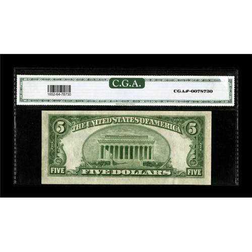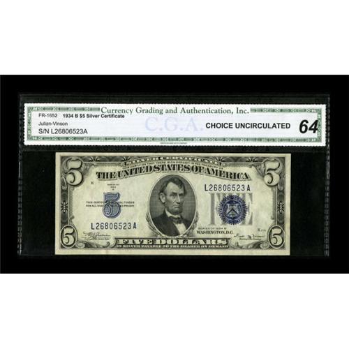 <B>Fr. 1652 $5 1934B Mule Silver Certificate. CGA Choice Uncirculated 64.</B></I><BR> This scarce Mule from the L-A block is ideally original with a counting wrinkle keeping the note from gem. The margins are ample for the grade and the overall eye appeal is pleasing.<BR><BR><b>Shipping:</b> Coins & Currency (<a target="_blank" href="http://www.heritageauctions.com/common/shipping.php">view shipping information</a>)