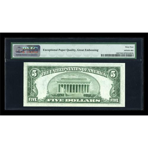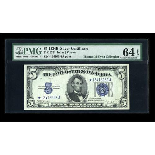 <B>Fr. 1652* $5 1934B Silver Certificate. PMG Choice Uncirculated 64 EPQ.</B></I><BR> This very scarce star note is fresh, original, and bears both the EPQ and "Great Embossing" notations. Why it is only a Choice 64 EPQ rather than a Gem 66 EPQ is perhaps better left to those who debate the number of angels who can dance on the head of a pin, but it certainly appears much nicer than its assigned grade of Choice 64 EPQ. <BR><I>From The Thomas M. Flynn Collection</B></I><BR><BR><b>Shipping:</b> Coins & Currency (<a target="_blank" href="http://www.heritageauctions.com/common/shipping.php">view shipping information</a>)