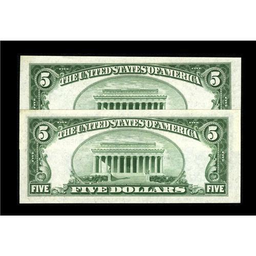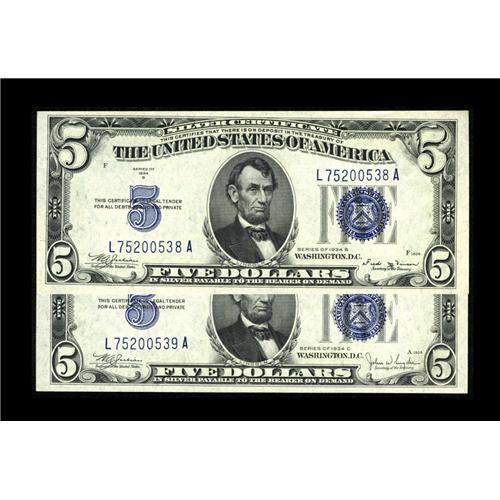 <B>Fr. 1652/Fr. 1653 $5 1934B/1935C Silver Certificate Changeover Pair. Gem Crisp Uncirculated.</B></I><BR>This pair rolls from Series 1934B to Series 1934C and is as attractive as one will find. The margins are solid and paper is impacable.<BR><BR><b>Shipping:</b> Coin/Currency (<a target="_blank" href="http://www.heritageauctions.com/common/shipping.php">view shipping information</a>)