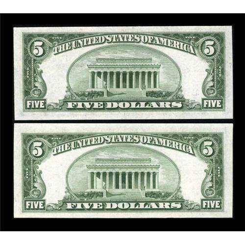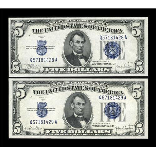 <B>Fr. 1653/1654 $5 1934C/1934D Silver Certificates. Changeover Pair. Very Choice Crisp Uncirculated.</B></I><BR> Original surfaces are found on this changeover pair. Some as made paper crinkles are noted in the margin of the second note.<BR><I>From The Drew Keough Collection</B></I><BR><BR><b>Shipping:</b> Coins & Currency (<a target="_blank" href="http://www.heritageauctions.com/common/shipping.php">view shipping information</a>)